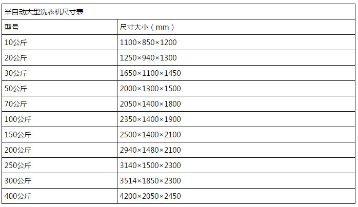 半自動工業(yè)洗衣機(jī)尺寸大小:目前市場中的半自動工業(yè)洗衣機(jī),從容量10公斤至400公斤有多個規(guī)格,不同的容量,相應(yīng)的周身體積也是不同的。雖說不同的廠家在產(chǎn)品質(zhì)量、性能控制上略有差異,但產(chǎn)品的尺寸卻是大同小異的,下表就上海力凈為大家羅列出了10至400公斤不同容量的半自動工業(yè)洗衣機(jī)的尺寸大小表。